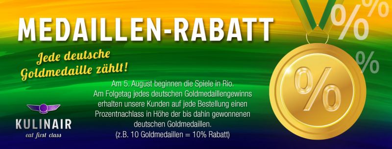 Wir von Kulinair haben uns ein besonderes Highlight für jede deutsche Goldmedaille einfallen lassen. Am Folgetag des Medaillengewinns erhalten unsere Kunden auf jede Bestellung einen Prozentnachlass in Höhe der bis dahin gewonnenen deutschen Goldmedaillen. (z.B. 10 Goldmedaillen = 10% Rabatt) Der Liefertermin spielt hierbei keine Rolle.