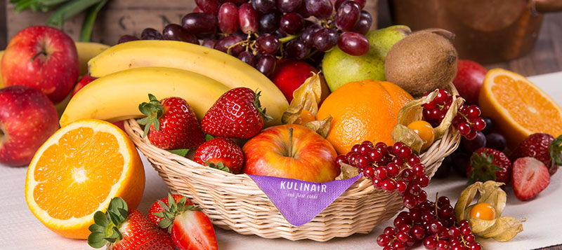 Marktfrische Früchte der Saison, wie z.B. Bananen, Äpfel, Erdbeeren, Kiwi, Orangen, Johannisbeeren, Ananas, Physalis, Weintrauben usw.