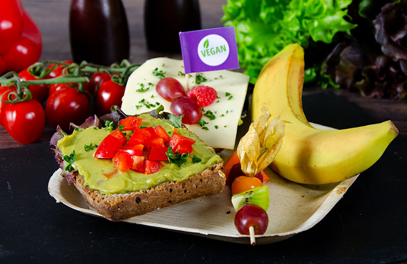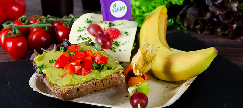 2 dunkle Brötchen belegt mit: verschiedenem veganen Belag, 1 Karibik-Spieß - Obstspieß mit frischen Früchten der Saison, 1 Banane