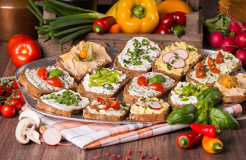 Eiersalat und Radies ∙ Hüttenkäse und Paprika ∙ hausgemachte Schafskäsecreme und halbgetrockneten Tomaten ∙ Mango-Aprikose-Chilie Aufstrich ∙ Basilikumcreme und Tomate ∙ Kräuterquark mit Lauch und mediterraner Frischkäsecreme aus getrockneten Tomaten.