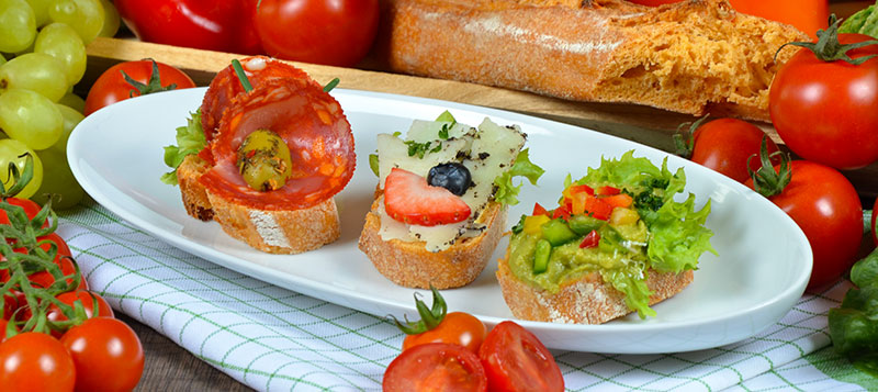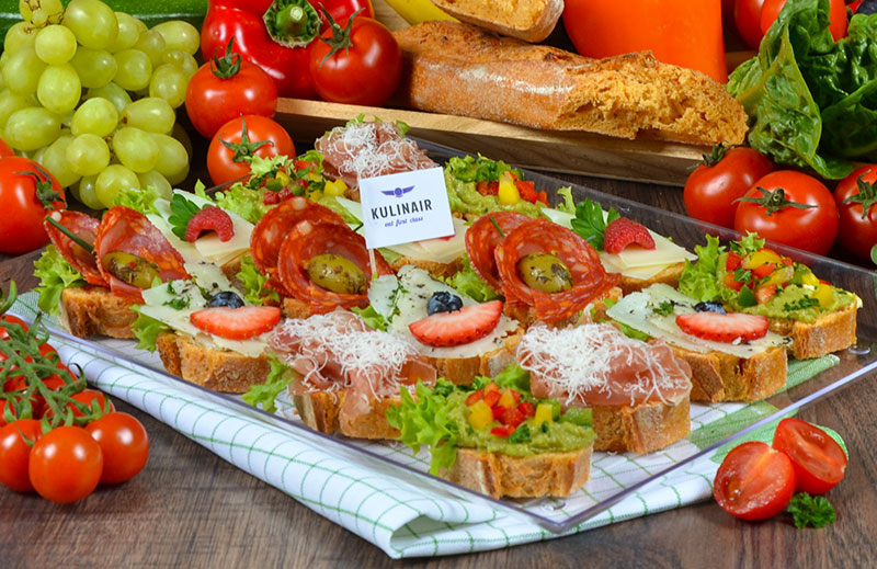 Tomaten-Paprika-Baguette auf knackigem Salat, belegt mit: Seranoschinken, Chorizosalami, Manchego-Käse, Trufa-Negra-Käse (schwarzer Trüffelkäse), Guacamole · garniert mit frischen Kräutern und frischem Obst und Gemüse der Saison.