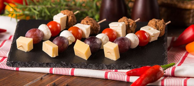 Gemischte Spieße mit:Hackbällchen ∙ Schafskäse ∙ Tomate ∙ Mozzarella ∙ Traube ∙ Gouda