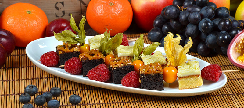 Gemischte Spieße mit: hellen und dunklen Browniewürfeln zwischen frischen Früchten der Saison.