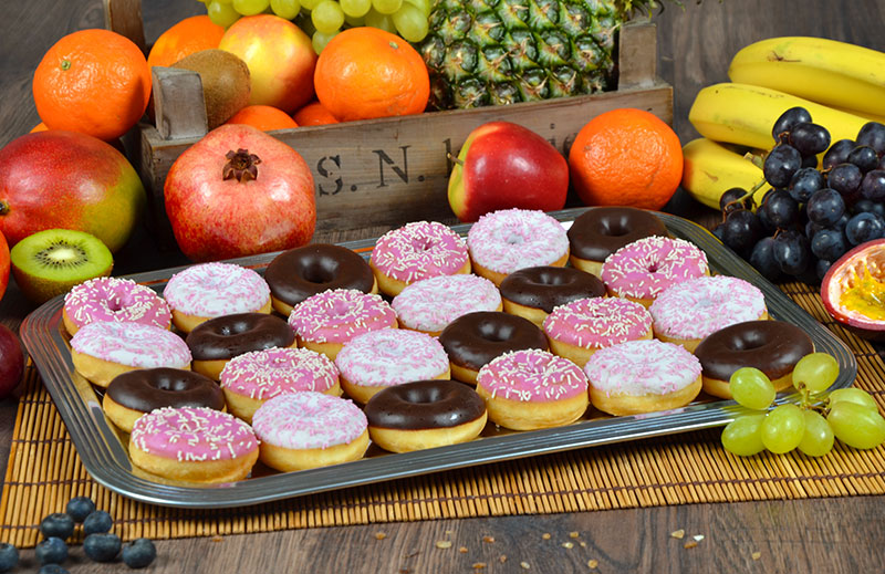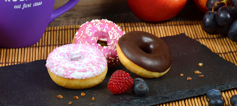 Gefüllte Mini-Donuts in den Sorten Erdbeer, Vanille und Schokolade.