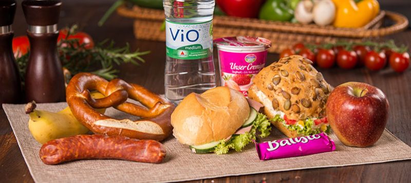 1 helles Brötchen mit Gouda, 1 dunkles Brötchen mit Schinken (auf Salat mit knackigem Gemüse)  ∙ Wasser 0,5l (medium)  ∙ Banane ∙ Schokoriegel ∙ Butterlaugenbrezel ∙ Joghurt ∙ Apfel ∙ Knacker