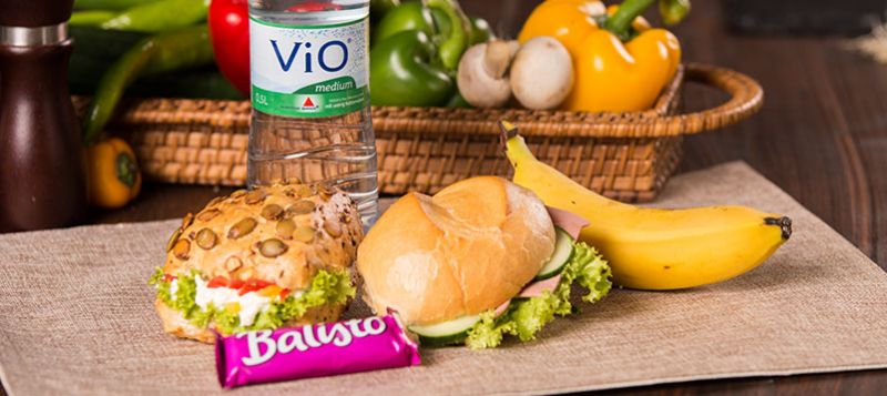 1 helles Brötchen mit Gouda, 1 dunkles Brötchen mit Schinken (auf Salat mit knackigem Gemüse) ∙ Wasser 0,5l (medium)  ∙ Banane ∙ Schokoriegel