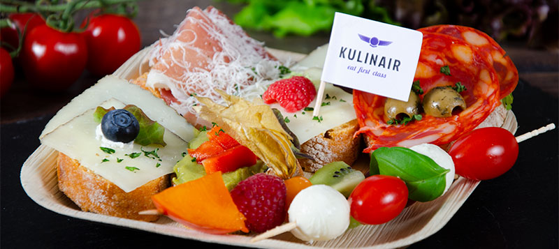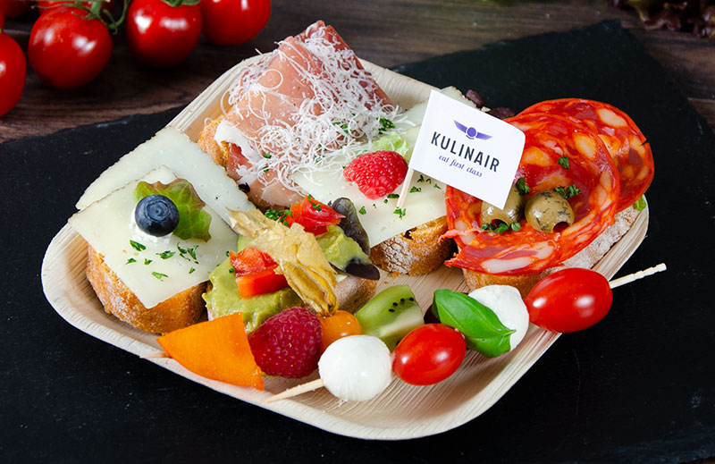5 Schnittchen Tomaten-Paprika-Baguette belegt mit: Serranoschinken, Chorizosalami, Manchego-Käse, Trufa-Negra-Käse (schwarzer Trüffelkäse), Guacomole, 1 Karibik-Spieß - Obstspieß mit frischen Früchten der Saison, 1 Toskana-Spieß - mit Tomate, Mozarella, Basilikum