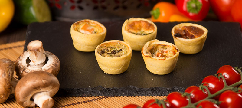 Köstliche Mischung aus Mini-Quiche als Fingerfood in fünf verschiedenen Sorten, mit einer Füllung, die auf der Zunge vergeht: