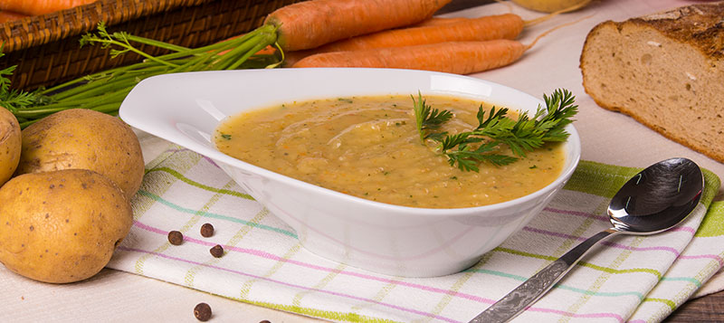 Kartoffelsuppe nach Art des Hauses aus regionalen Kartoffeln mit Wiener Würstchen der Fleischerei During (Goldmedaille bei den Sächs. Meisterschaften 2013). Auf Wunsch werden die Wiener auch separat geliefert, dann ist die Kartoffelsuppe vegetarisch.